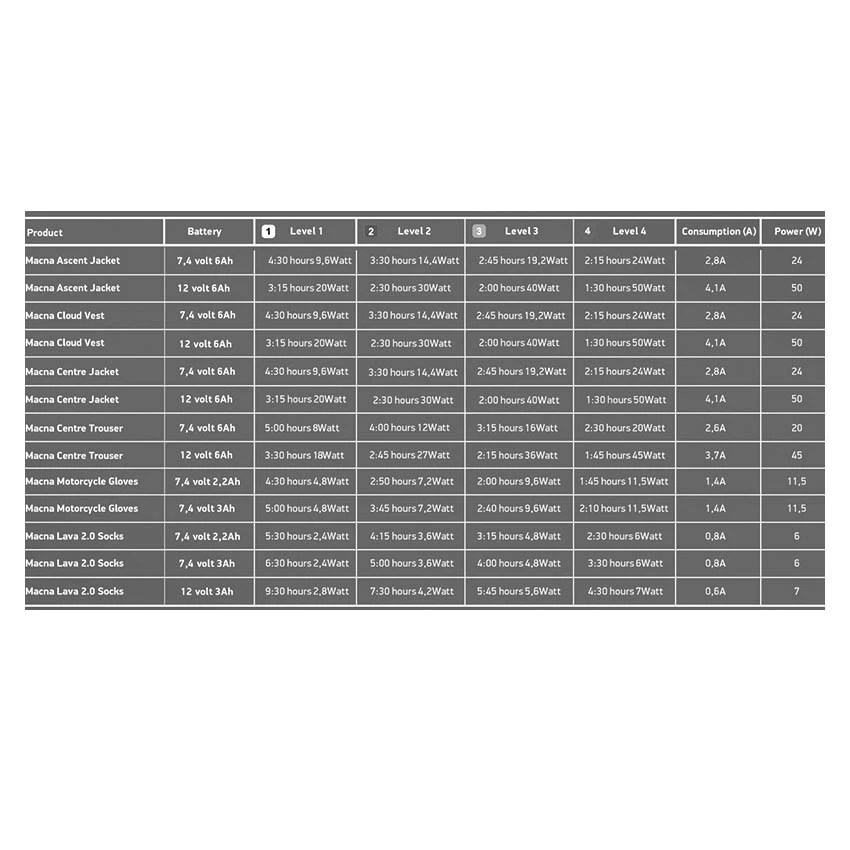 The Macna Ascent jacket can be connected to the motorcycle battery via cabling, or stand-alone battery sets can be used. The following options are possible: