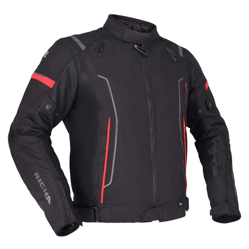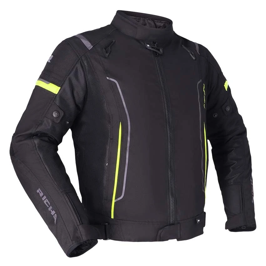 The Richa Airstream 3 motorcycle jacket combines a durable fabric with mesh panels to ensure it is both comfortable, safe and light. The Aquashell LTD membrane keeps your upper body dry in all conditions, the membrane is removable, just like the thermal lining. Richa provides the collar and the ends of the sleeves with neoprene to prevent irritations. The Airstream 3 has a sporty cut but has lots of adjustability on the upper arms, the forearms and at the waist. High-quality D3O protectors on the shoulders, elbows and back complete the Airstream 3 jacket.